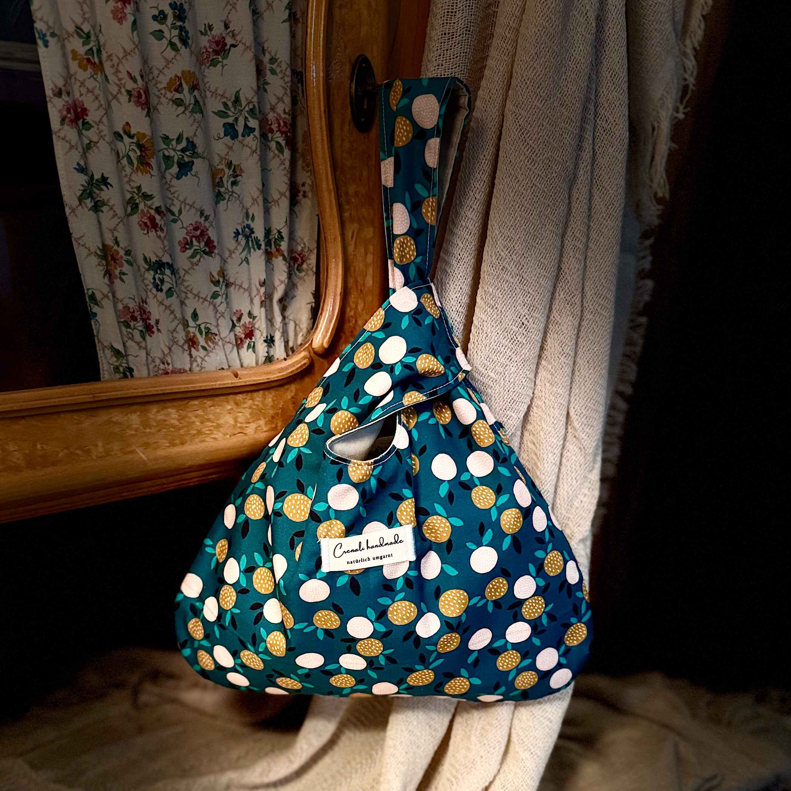 Bunt, fröhlich und voller Lebenslust – unsere japanische Knotentasche im Design Früchtetanz macht schon beim Ansehen gute Laune! Handgenäht aus 100% Baumwolle (Innen- und Außenstoff) ist sie robust, leicht und angenehm zu tragen.