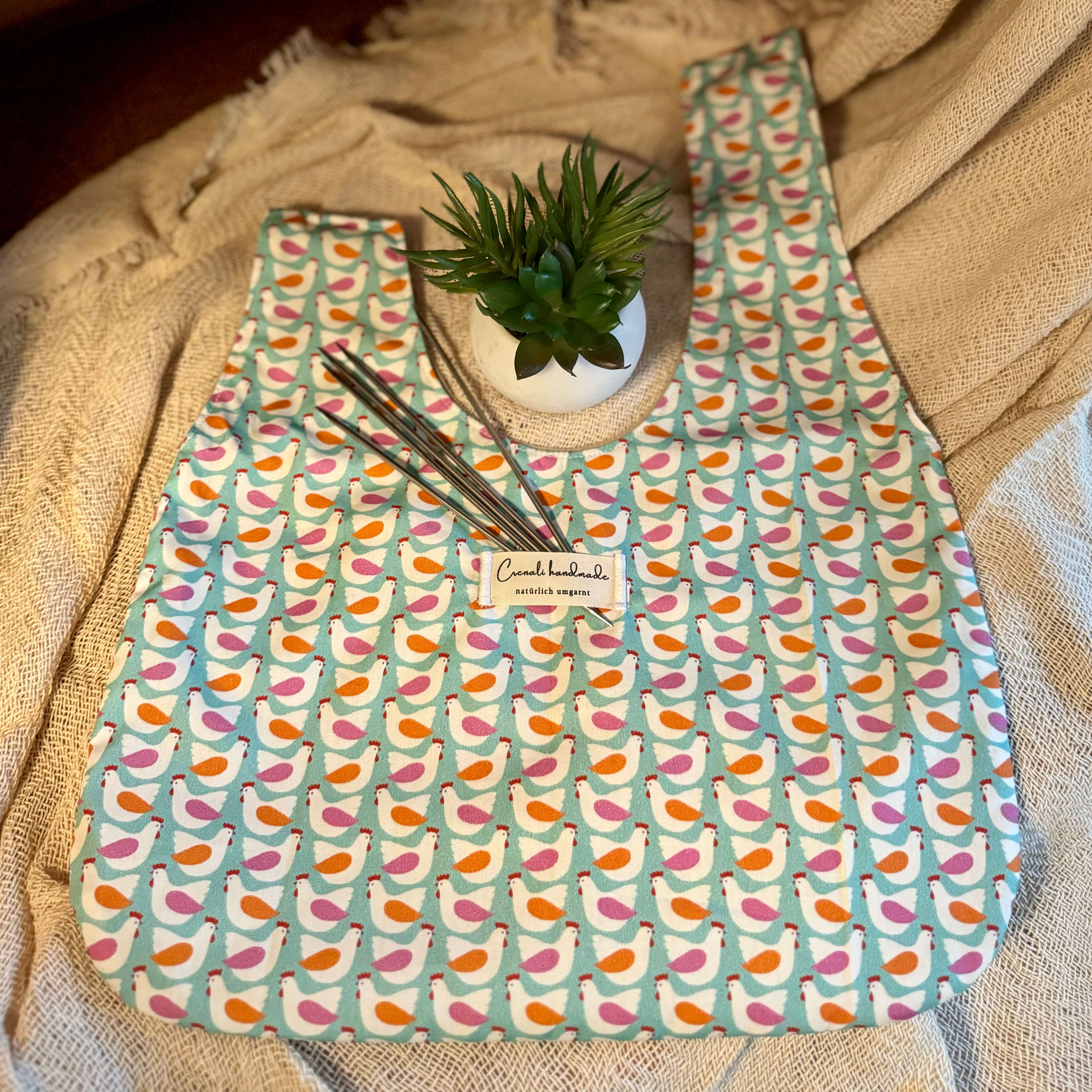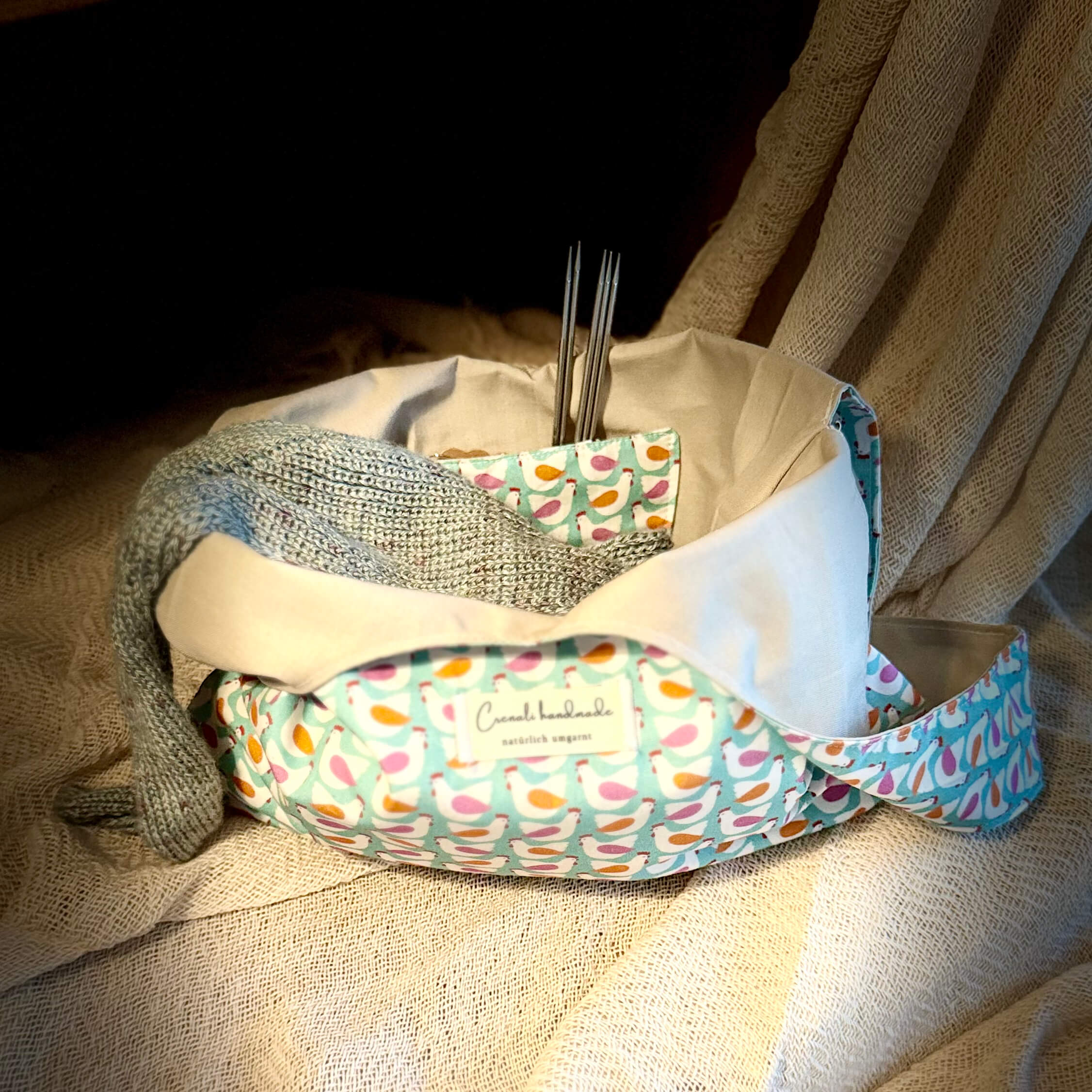 Die Knotentasche Piepmatz ist nicht nur eine praktische Projekttasche, sondern auch ein charmantes Accessoire, das mit seinem fröhlichen Vogelmotiv sofort ins Herz fliegt. In Kombination mit den passenden Nadelgaragen im gleichen Design entsteht ein harmonisches Set, das Ordnung und Freude vereint.