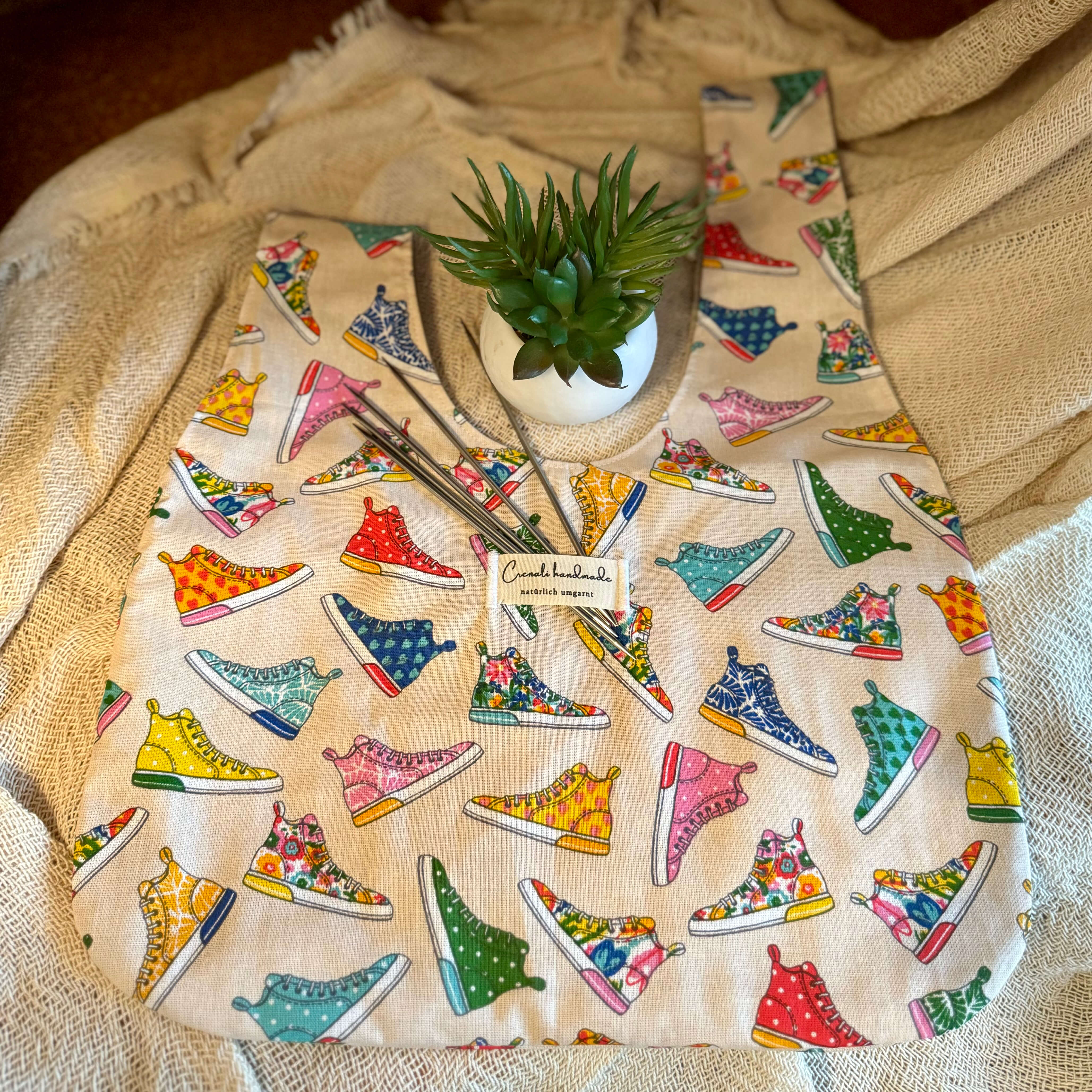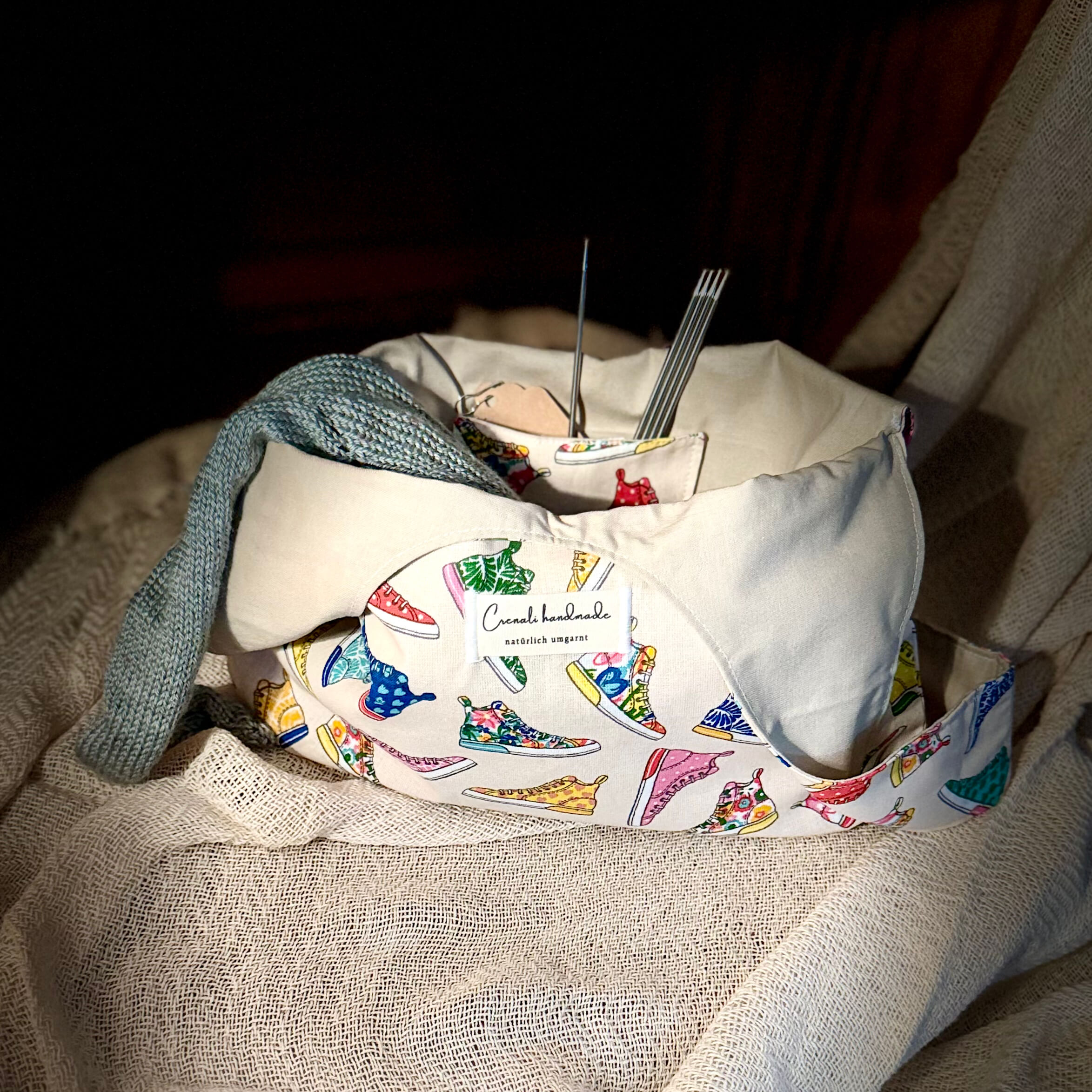 Die Knotentasche Sneakerliebe ist nicht nur eine funktionale Projekttasche, sondern auch ein stylisches Accessoire, das mit seinem sportlich-fröhlichen Design sofort gute Laune verbreitet. Perfekt wird es, wenn du sie mit den passenden Nadelgaragen im gleichen Design kombinierst – so entsteht ein harmonisches Set, das praktisch und schön zugleich ist.