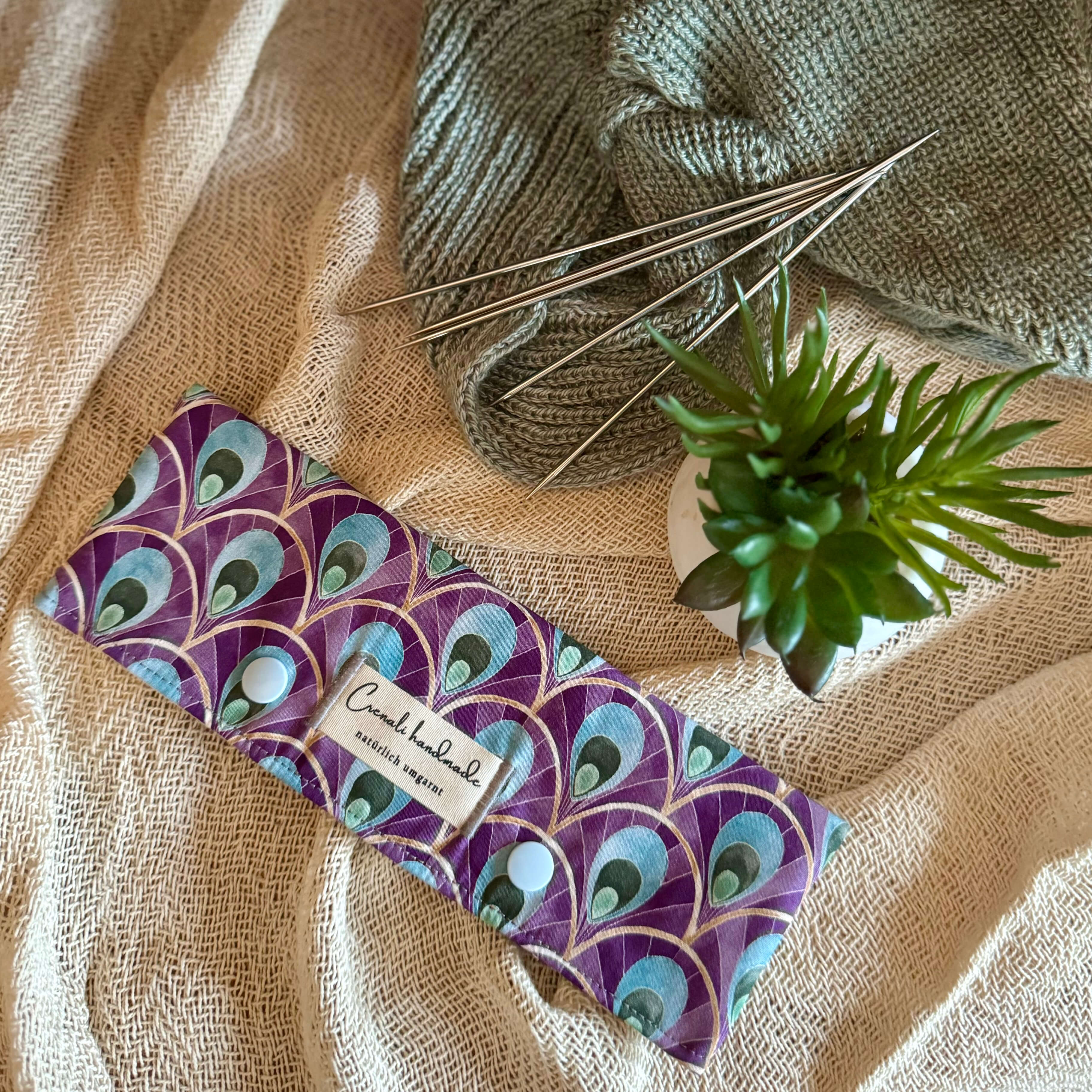 Wie das schillernde Auge einer Pfauenfeder entfaltet dieses Design seinen ganz eigenen Zauber: Die handgenähte Nadelgarage „Pfauenfeder“ besticht mit edlen Farben, kunstvollen Formen und einem Hauch von Exotik. Ein echter Blickfang in deiner Projekttasche – für alle, die das Besondere lieben.