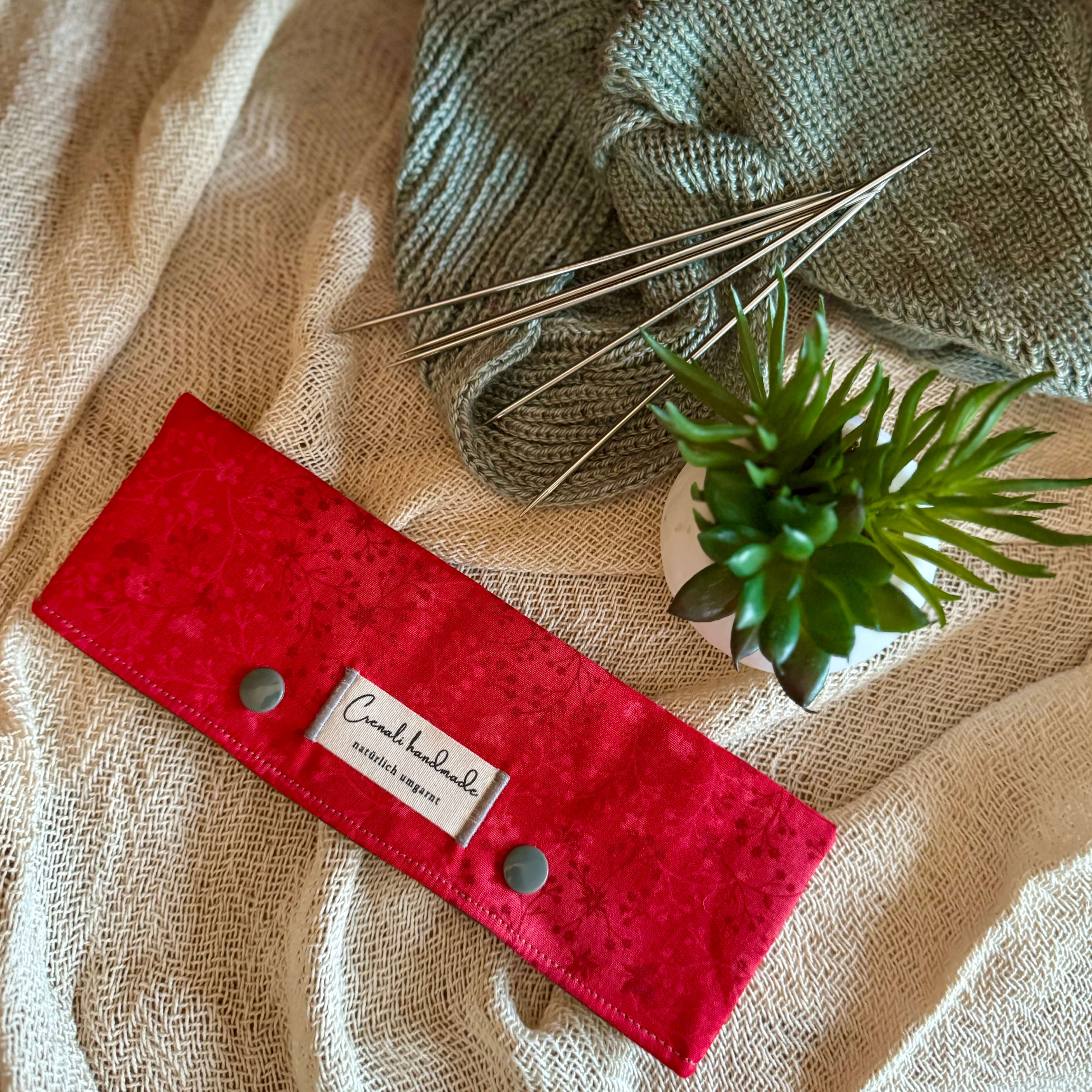 Gefertigt aus 100 % Baumwolle (Außen- und Futterstoff) und gefüttert mit einem weichen Vlies aus 100 % Polyester, bietet die Tasche sicheren und sanften Schutz für deine Nadelspiele – ob kurz oder lang.