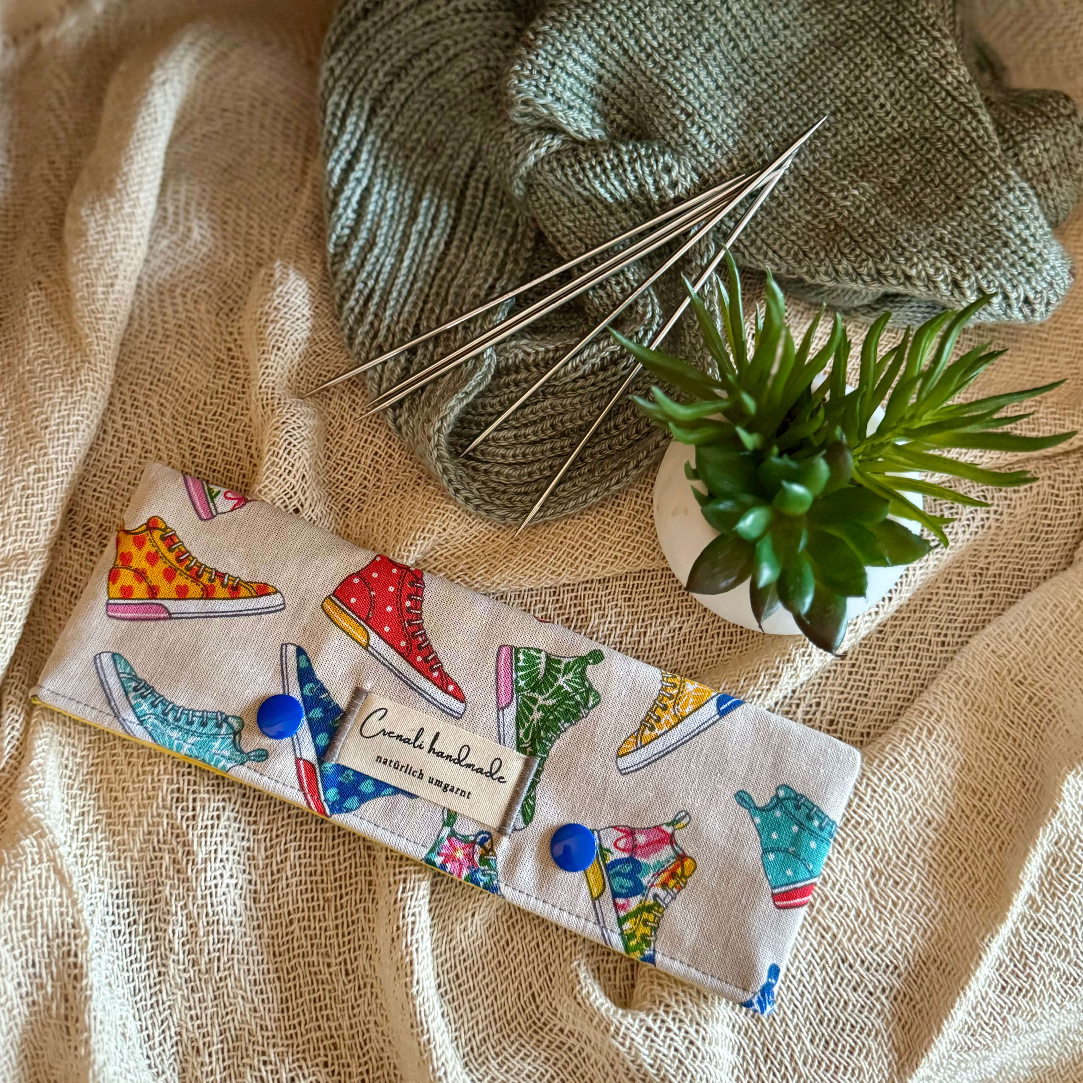 So individuell wie du – und genauso bunt wie das Leben. Unsere handgenähte Nadelgarage „Sneakerliebe“ bringt mit ihrem farbenfrohen Turnschuh-Design frischen Wind in dein Strickzubehör. Jedes Paar Sneaker auf dem Stoff ist anders – genau wie jedes Projekt, das du auf den Nadeln hast.