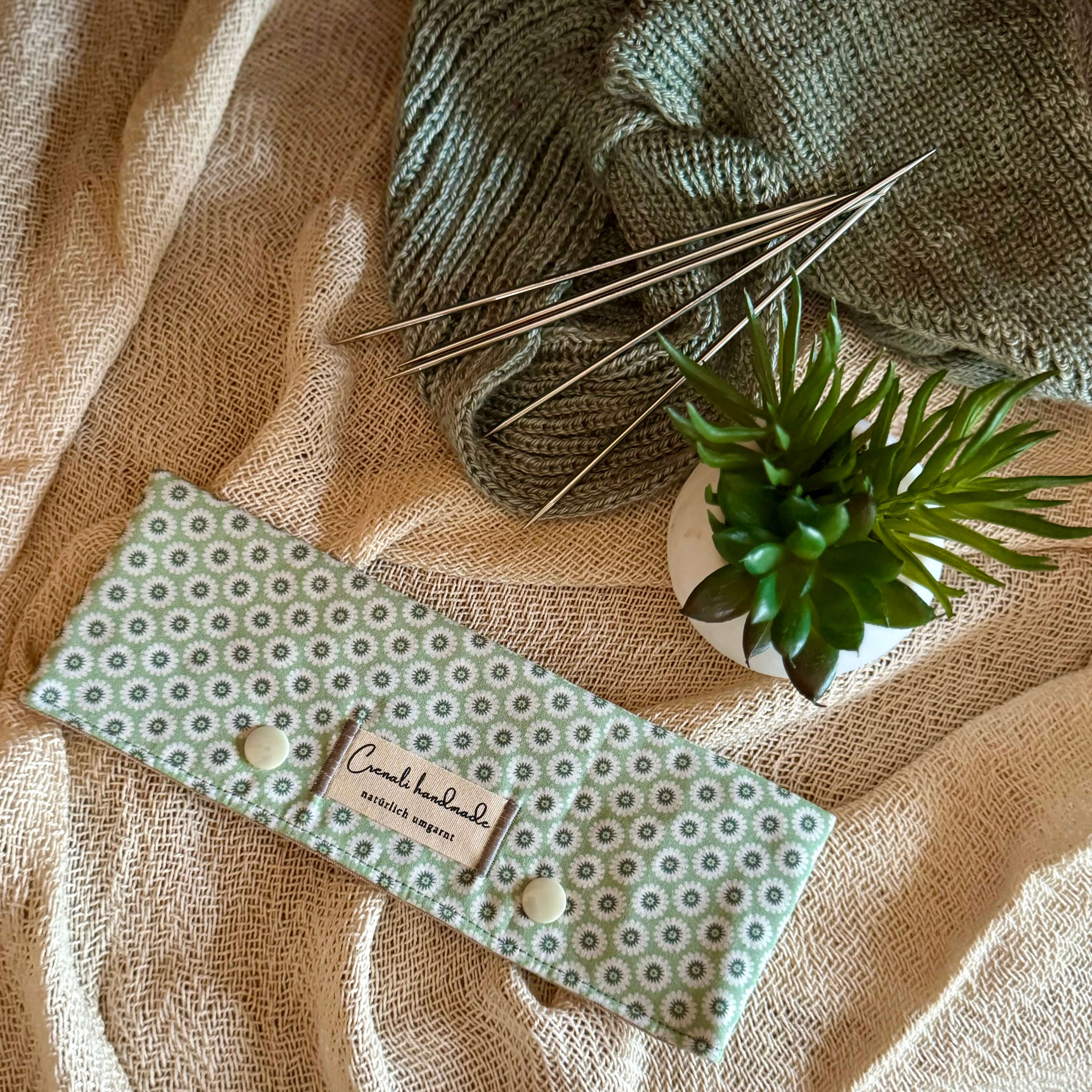 Leicht wie ein Sommertag, fein wie eine handgepflückte Wiesenblume: Unsere handgenähte Nadelgarage „Wiesenpoesie“ bezaubert mit einem zarten Muster aus kleinen, blütenähnlichen Kreisen auf sanftem Grün. Sie wirkt ruhig, verspielt und bringt genau die richtige Portion Naturgefühl in deine Projekttasche.
